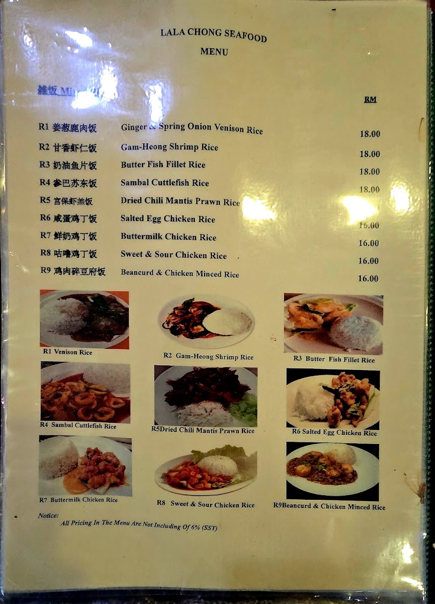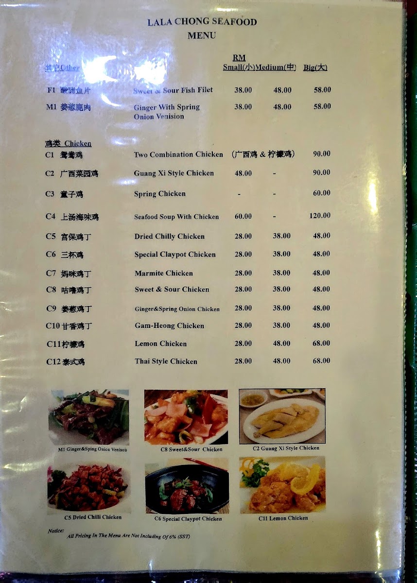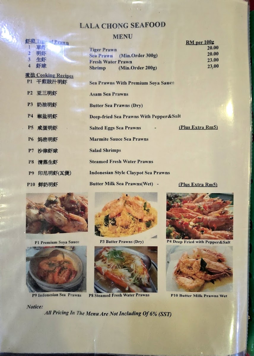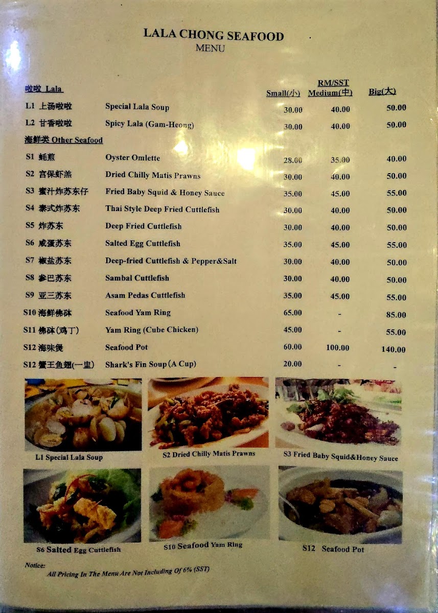 The menu at Lala Chong Seafood Village (Ara Damansara) focuses primarily on seafood and Chinese cuisine, featuring a variety of dishes that highlight fresh seafood and traditional Chinese flavors. The offerings are organized into several main categories to cater to different dining preferences and meal occasions.
