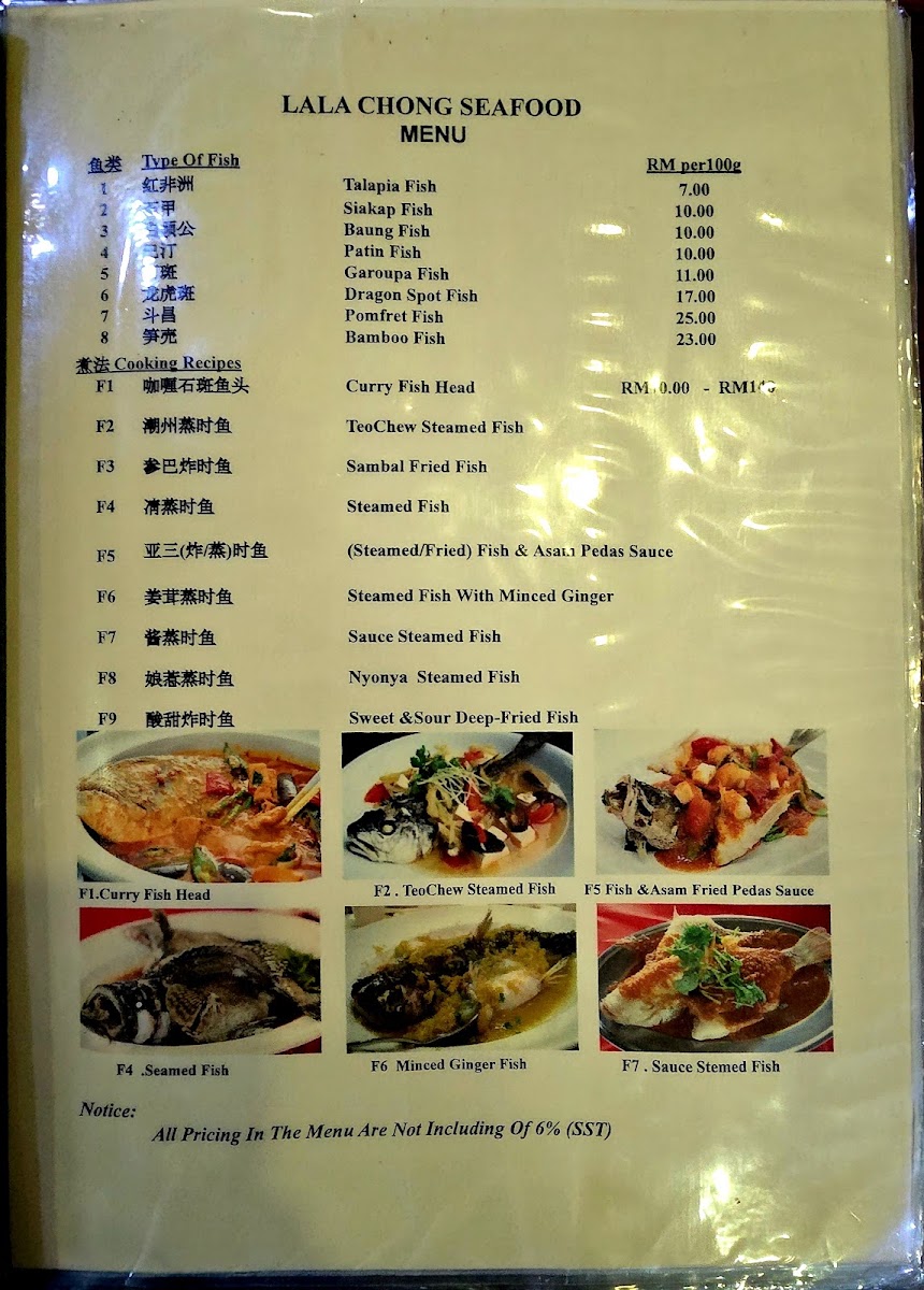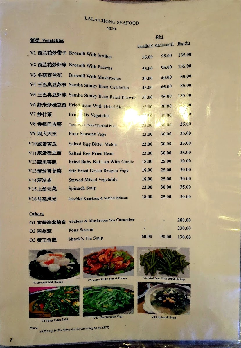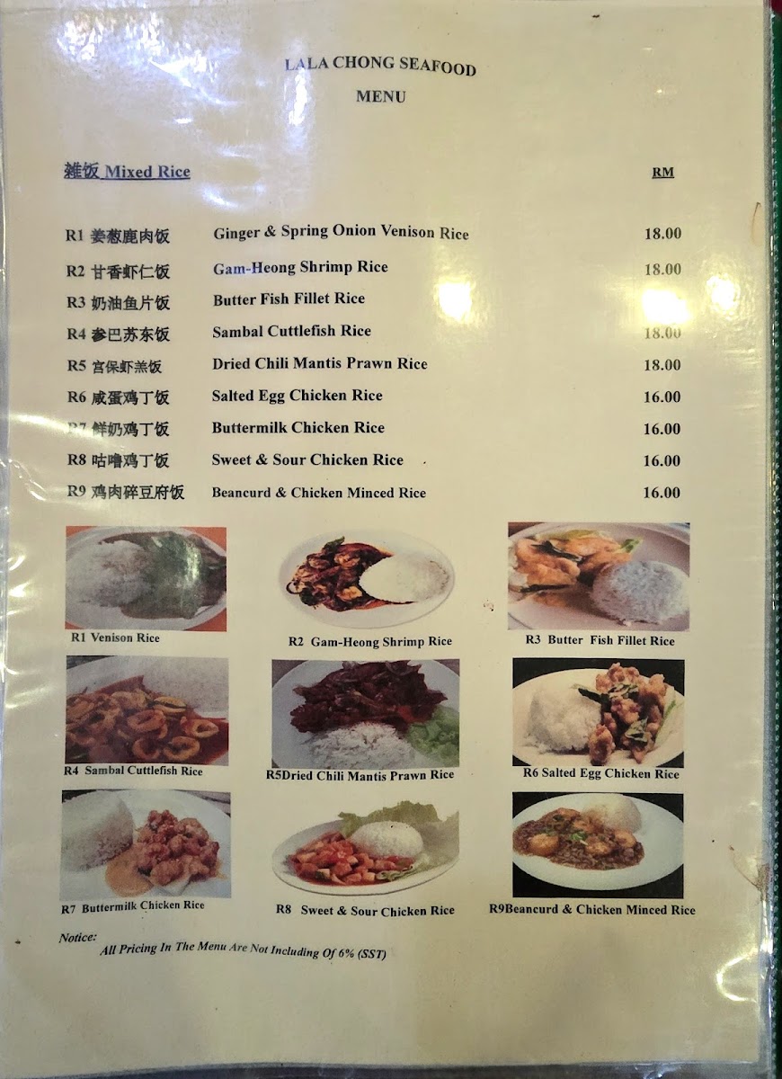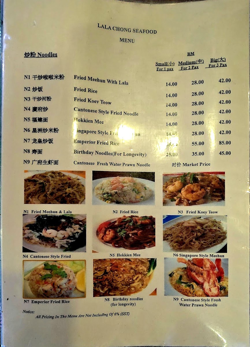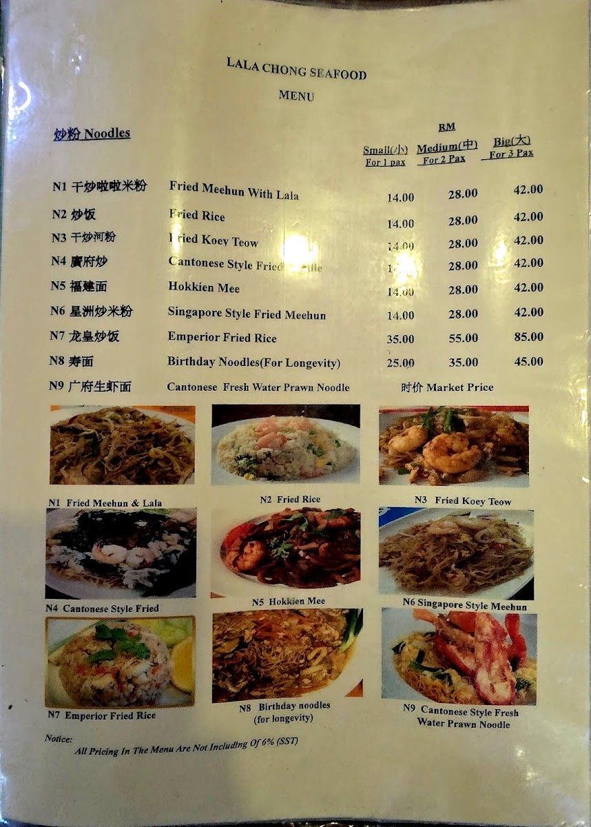 The menu at Lala Chong Seafood Village (Ara Damansara) focuses primarily on seafood and Chinese cuisine, featuring a variety of dishes that highlight fresh seafood and traditional Chinese flavors. The offerings are organized into several main categories to cater to different dining preferences and meal occasions.