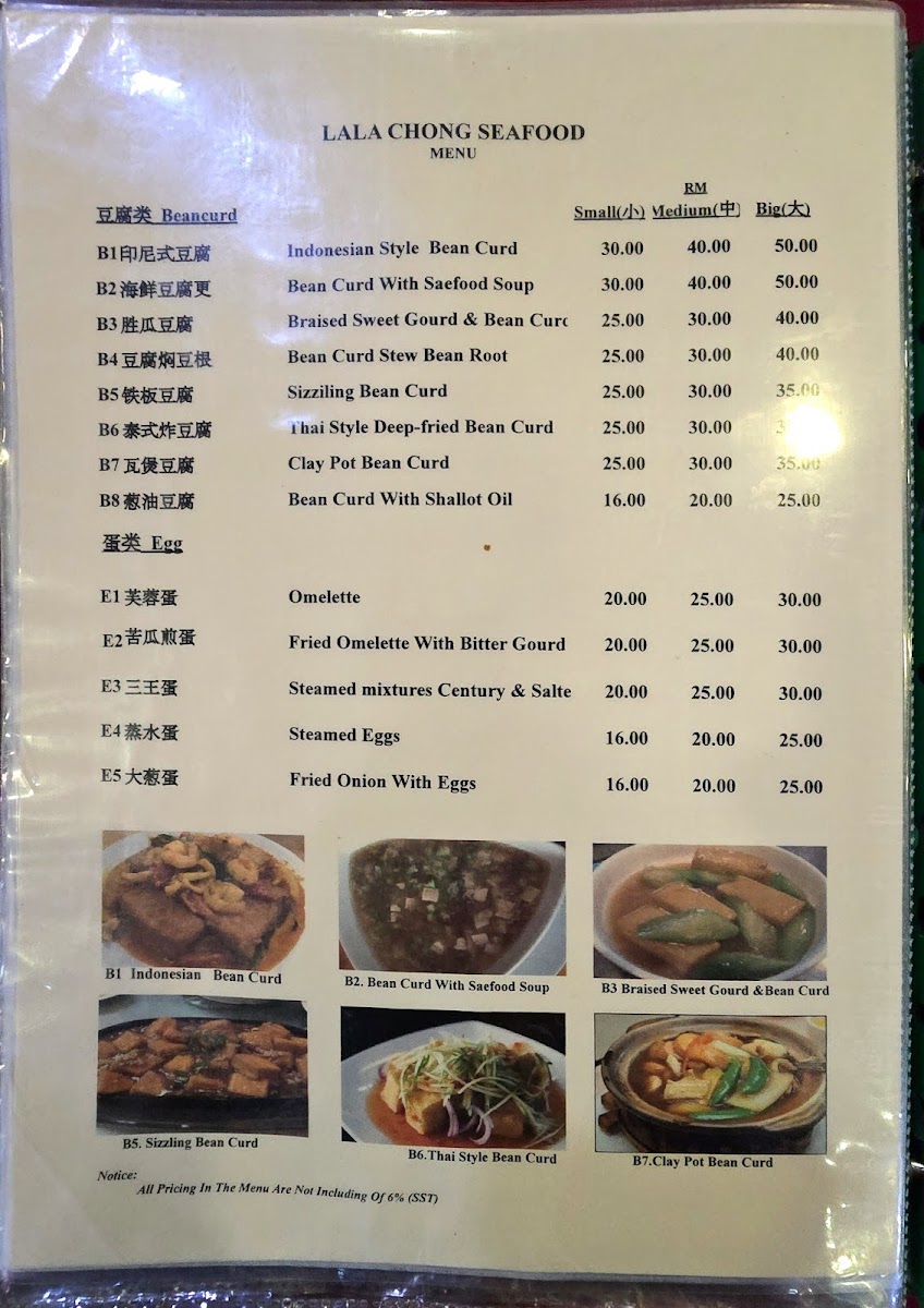 Additional Seafood and Specialty Dishes: The menu also includes a range of other seafood items and specialty dishes such as Steamed Dragon Sport Fish, Special Lala Soup, Mantis Prawn Dry Chili, and Clay Pot Bean Curd, among others.